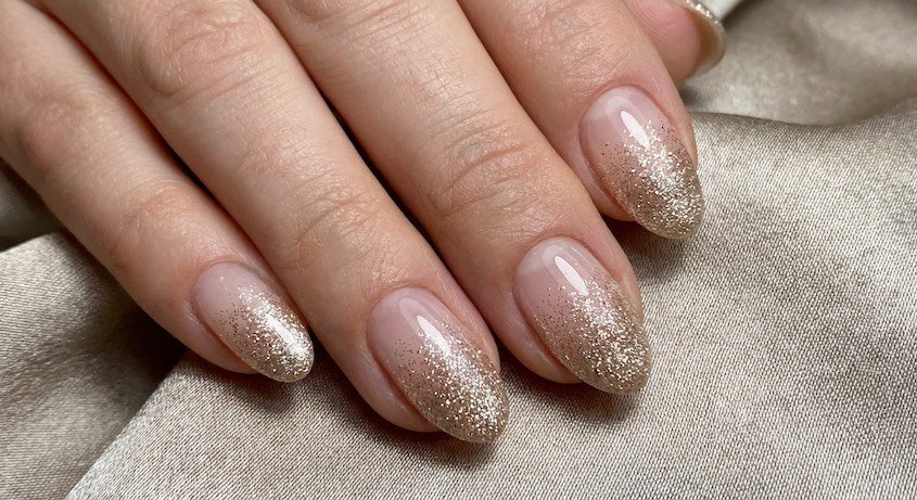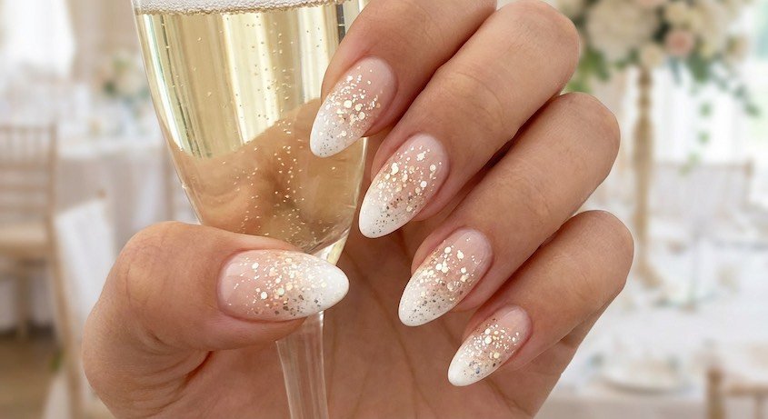 Create a celebratory design by adding tiny “bubbles” of white or champagne glitter rising from nude bases to white tips. This playful yet sophisticated design captures the joy and effervescence of your wedding celebration.