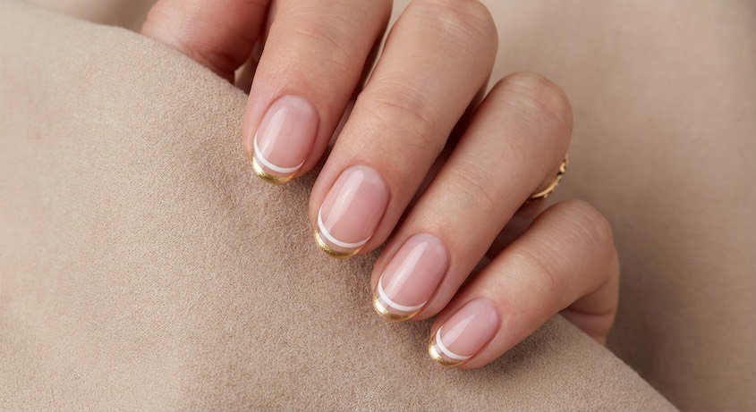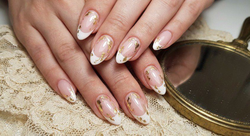 Incorporate delicate gold leaf accents over a classic French base. Apply small pieces of gold leaf randomly or create intentional patterns for a luxurious, vintage-inspired finish. This design works particularly well for art deco or gatsby-themed weddings.
