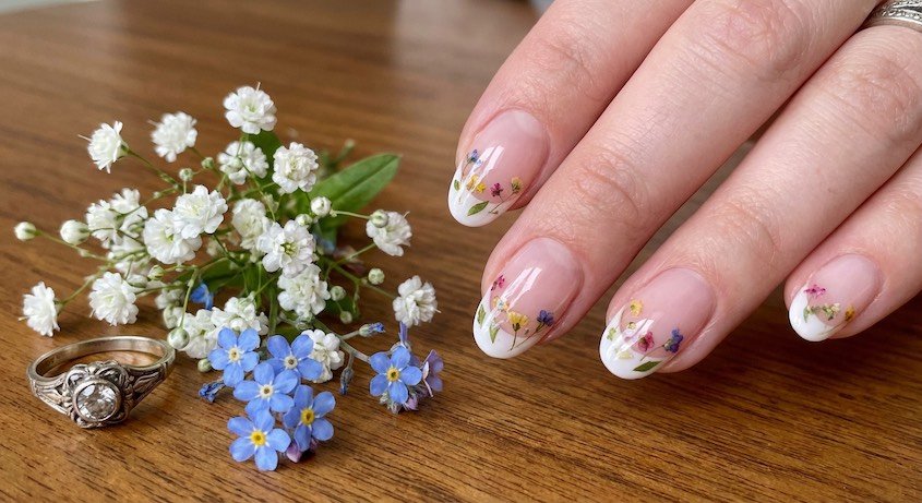 Embed tiny dried flowers between base coat and top coat layers for a romantic, organic touch. Choose delicate blooms like baby’s breath or forget-me-nots. This design brings natural beauty to your fingertips and can incorporate flowers from your wedding theme.