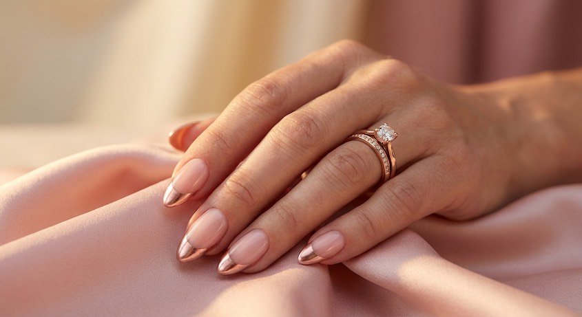 Replace traditional white tips with soft rose gold for a romantic, modern twist. This design complements warm-toned jewelry and adds a subtle glamour without being overpowering. The metallic finish catches light beautifully in photographs and pairs wonderfully with blush-toned wedding palettes. This is one of our favorite wedding nails for brides.